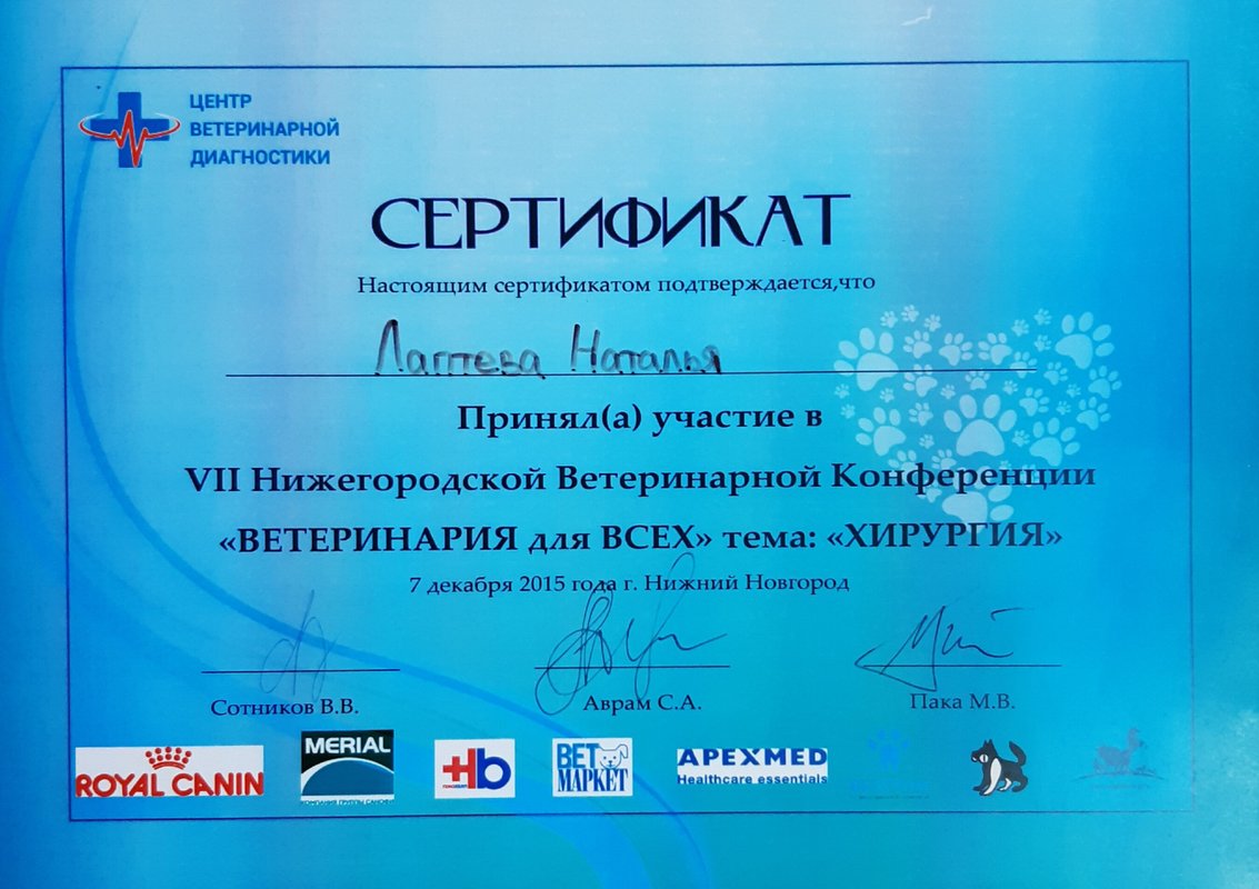 4) участник мастер класса по ветеринарной хирургии "Хирургические курсы. Первая ступень" с 16 по 18.12.2019 "Ветеринарный госпиталь "от носа до хвоста"" гор. Н.Новгород
