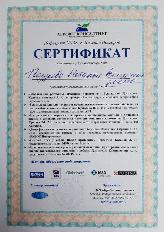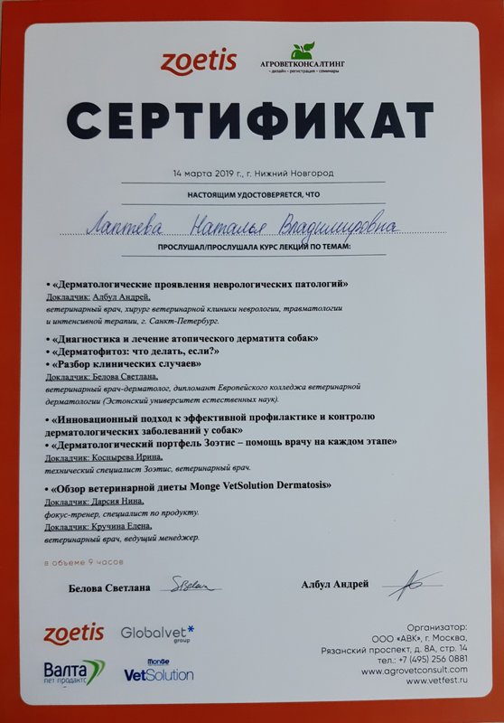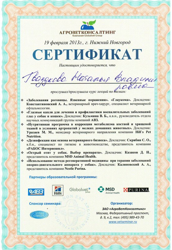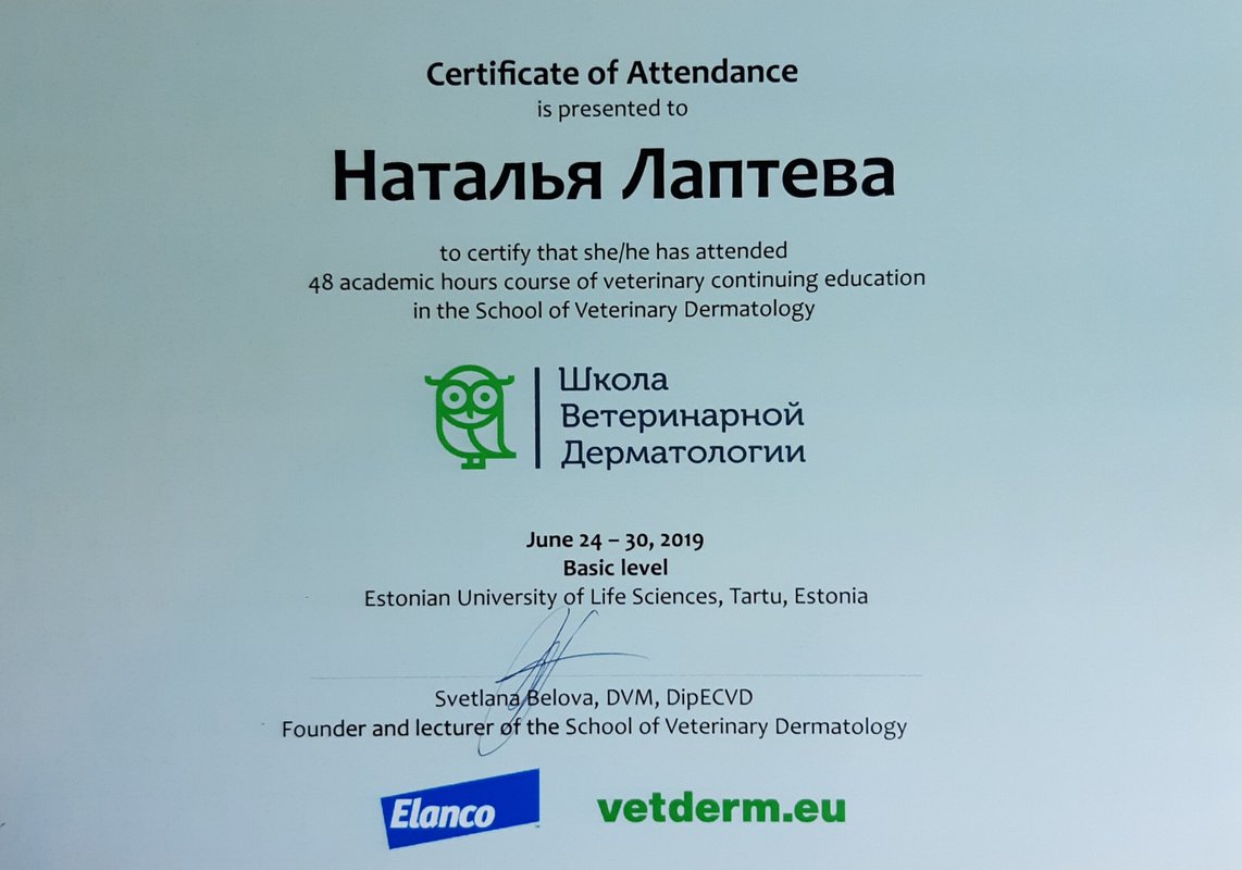 «Принял участие в школе постдипломного образования Hill'S на тему "основы дерматологического приема для врачей общего профиля"
