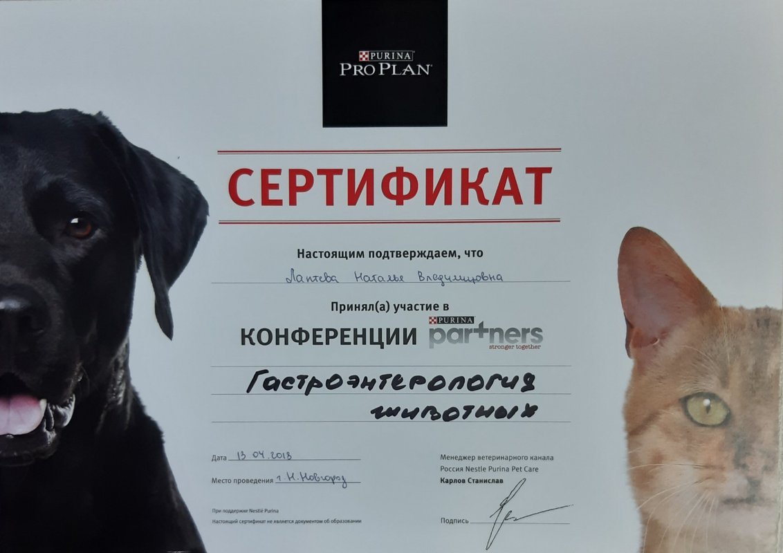 1) участие в конференции "Гастроэнтерология животных" от 13.04.2018 "Partners" гор. Н.Новгород